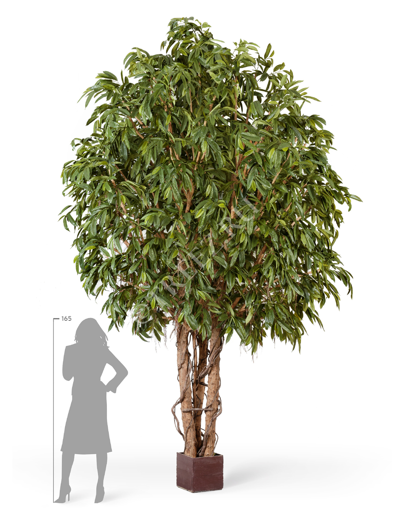 Размеры: высота вместе с кашпо - 420 см, диаметр кроны - 270 см, высота ствола от верха горшка до первой ветки - 110 см, диаметр стволов от 8 до 13 см, ширина расположения стволов 40-45 см.
